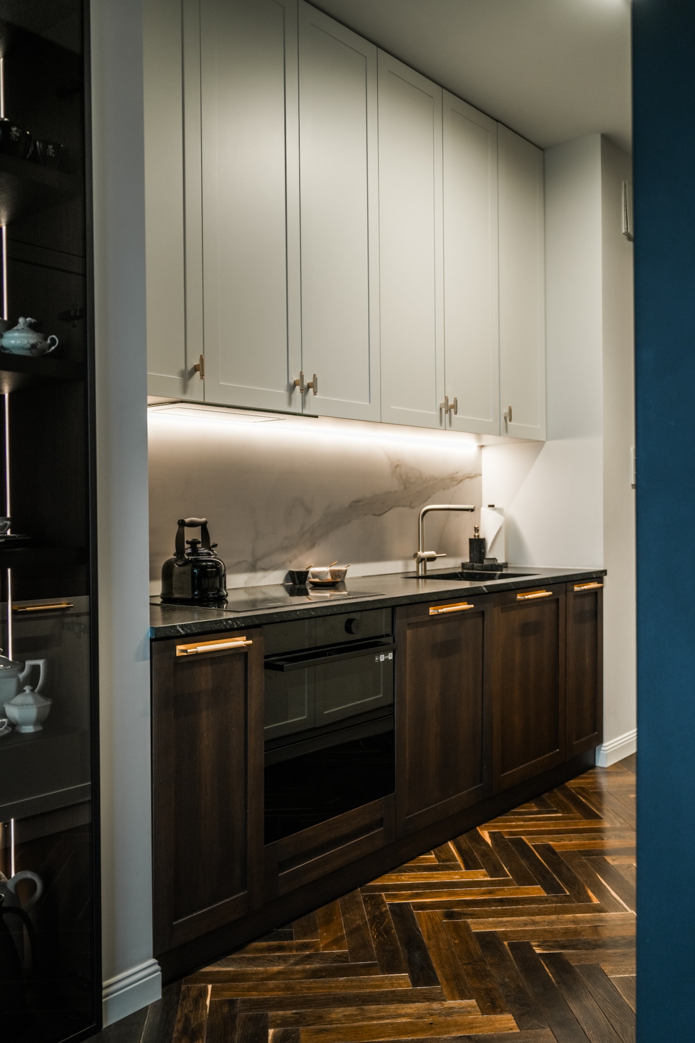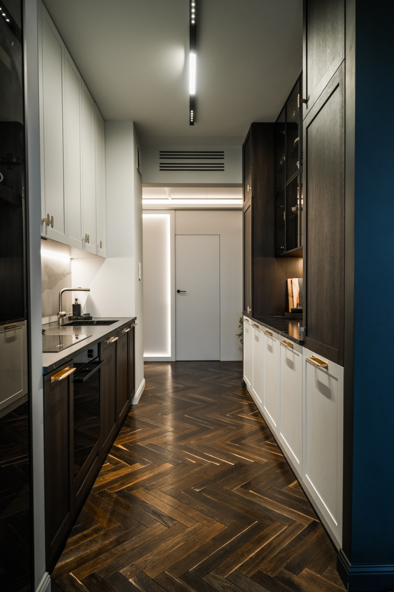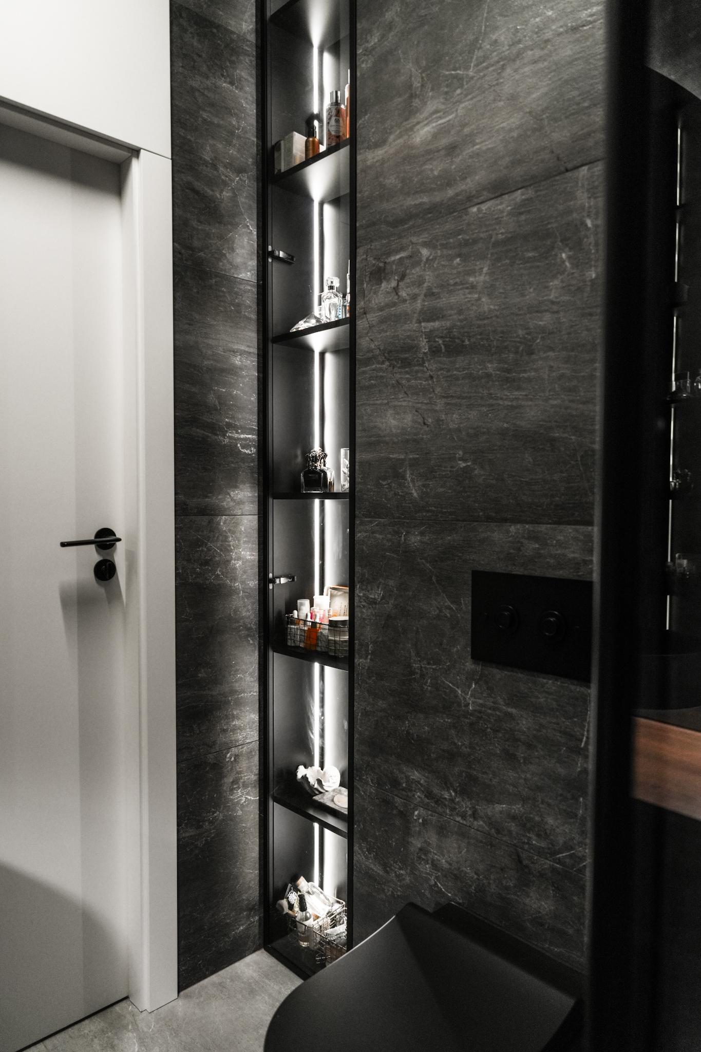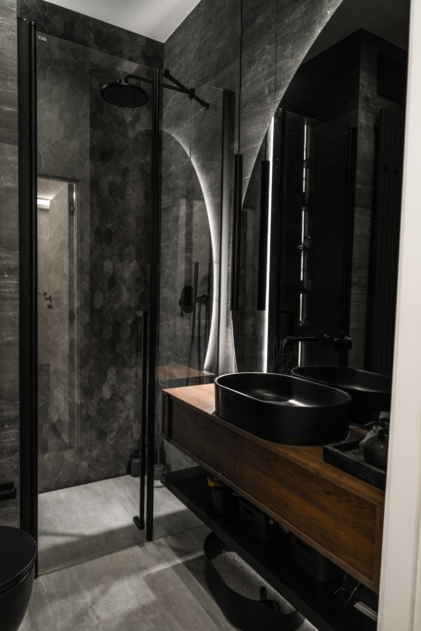 Ta realizacja powstała na bazie projektu dostarczonego przez klienta, który od początku miał jasno określoną wizję wnętrza eleganckiego, wyrazistego i utrzymanego w ciemnej, bardziej nastrojowej kolorystyce. Naszym zadaniem było przełożenie tej koncepcji na realną przestrzeń z zachowaniem wszystkich detali, proporcji i jakości wykonania.