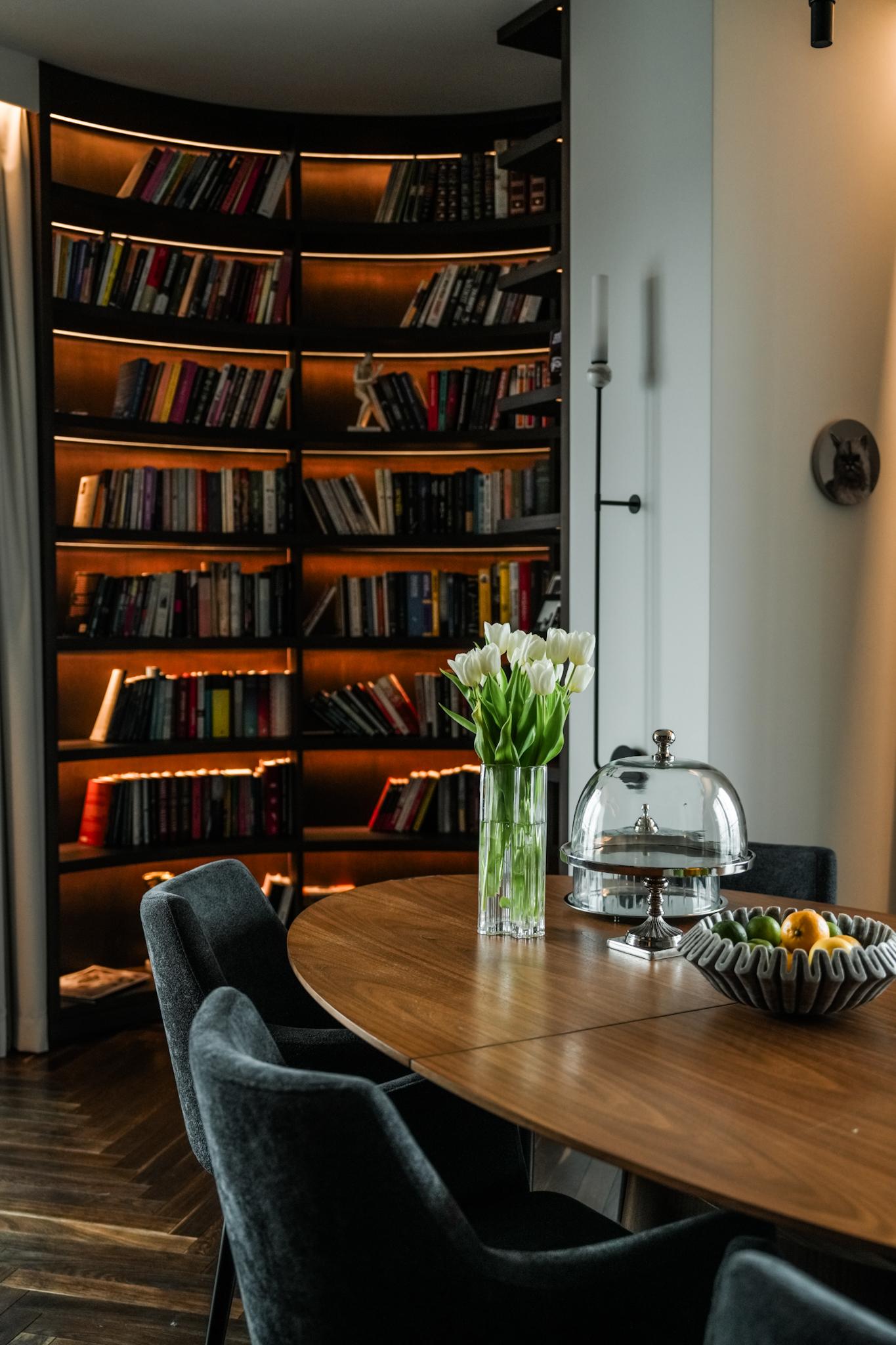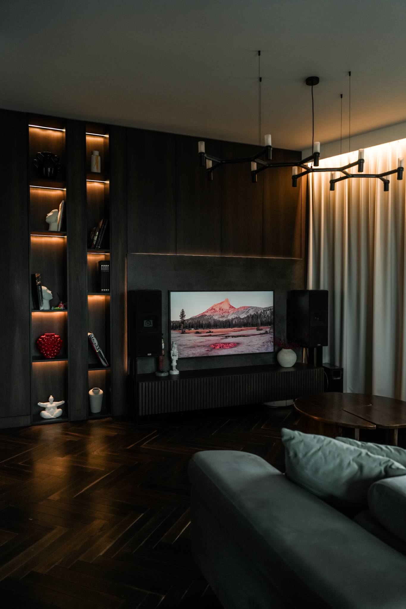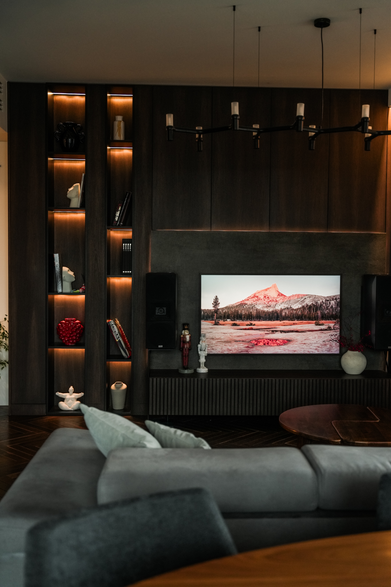 Zakres prac obejmował kompleksowe wykończenie mieszkania pod klucz oraz wykonanie mebli na wymiar, które były kluczowym elementem całej aranżacji. Szczególną uwagę poświęciliśmy zabudowom stolarskim: od biblioteki, przez zabudowę RTV, po elementy kuchni, które musiały być nie tylko estetyczne, ale również perfekcyjnie dopasowane do przestrzeni i oświetlenia.