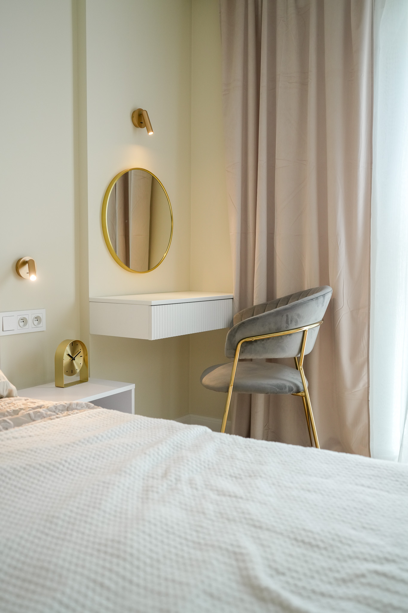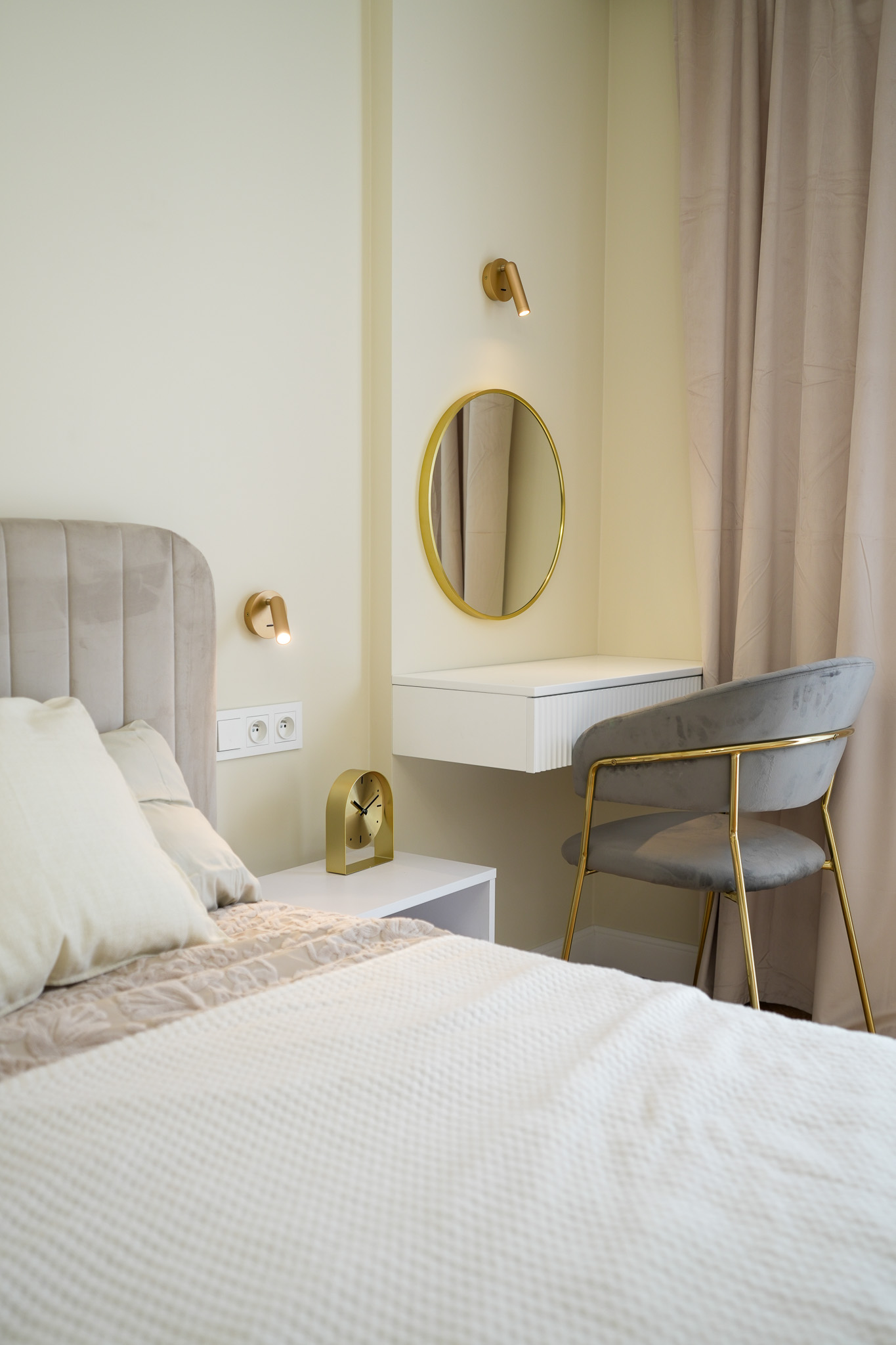 Projekt wnętrza został oparty na spokojnej, neutralnej palecie barw, z dominacją beży, jasnych kremów, naturalnego drewna oraz subtelnych akcentów złota. Styl wnętrza łączy nowoczesną elegancję z miękką, przytulną estetyką, dzięki czemu mieszkanie jest jednocześnie reprezentacyjne i komfortowe w codziennym użytkowaniu.
