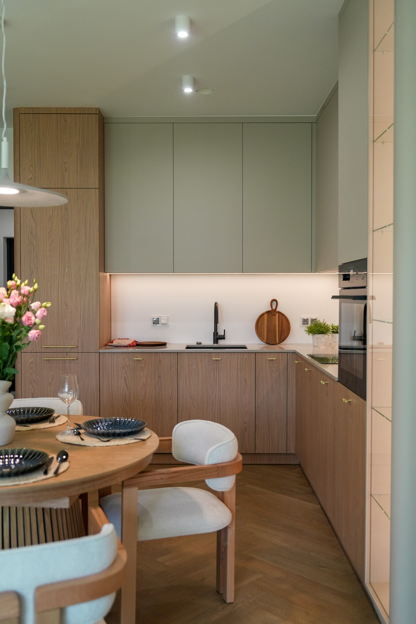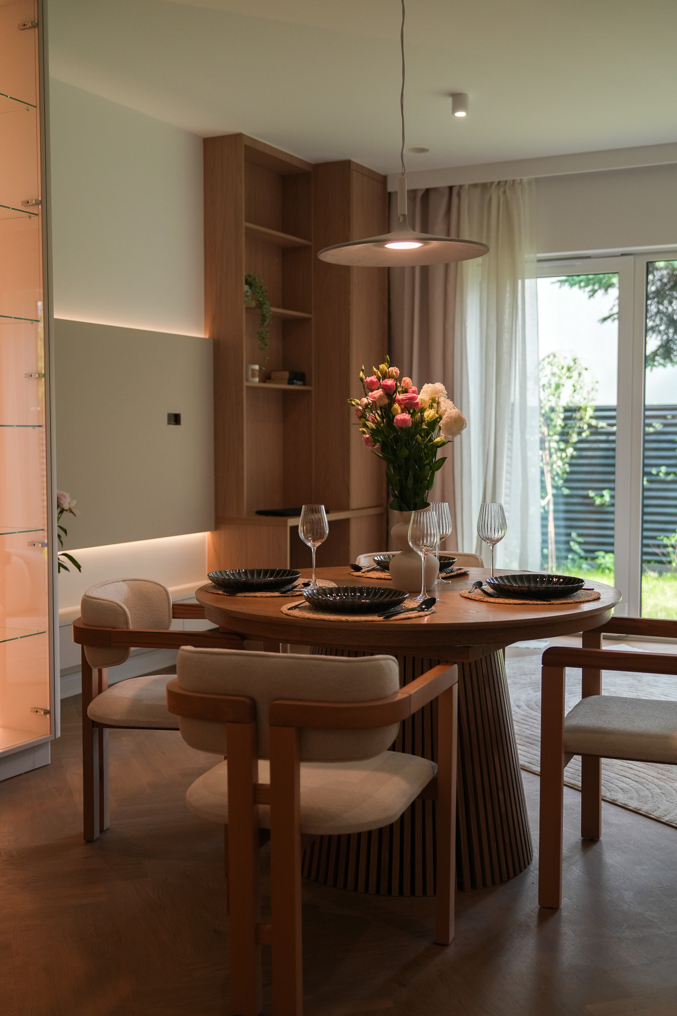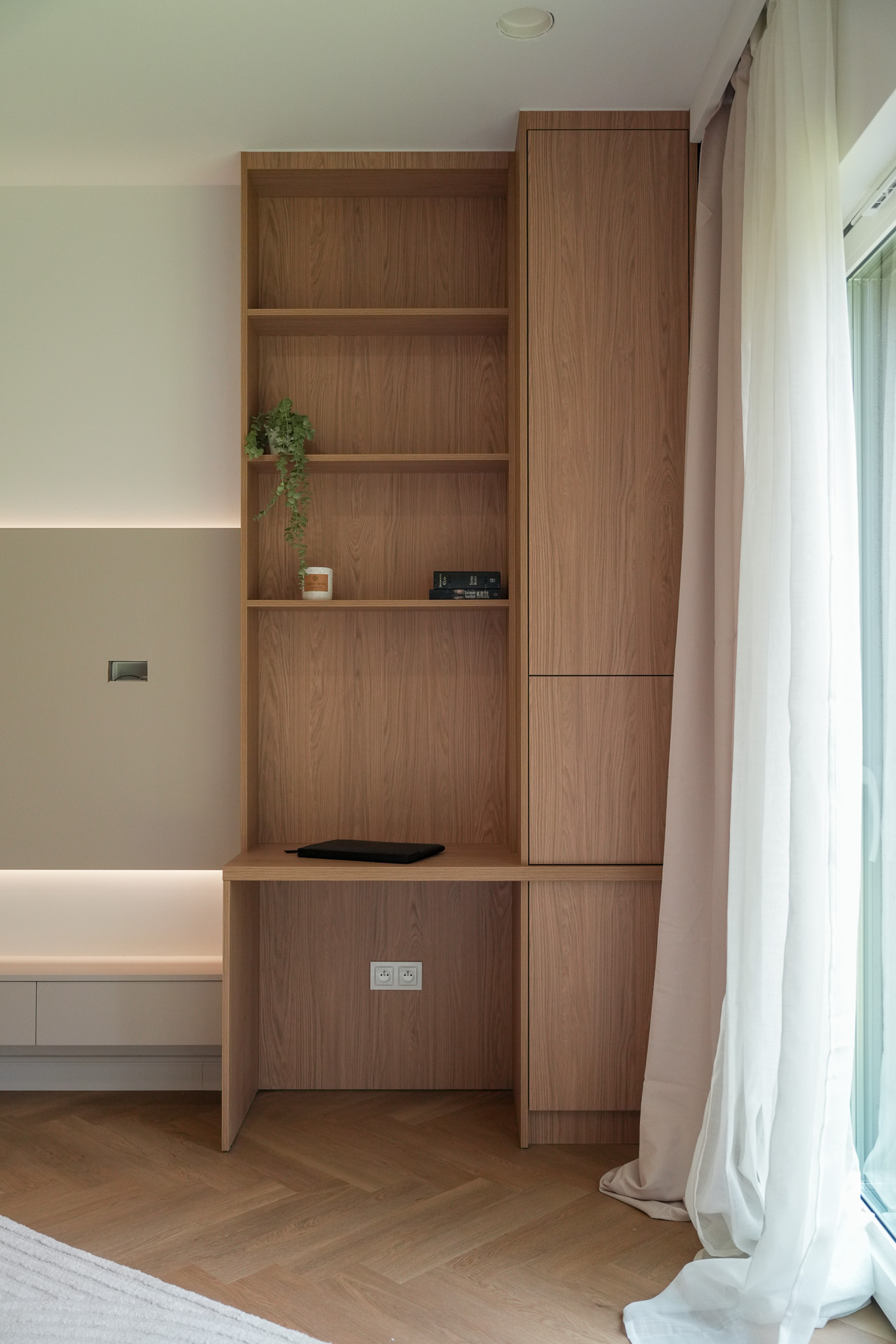 Projekt wnętrza został opracowany indywidualnie, z naciskiem na ergonomię, spójność stylistyczną oraz komfort codziennego użytkowania. Dominują tu jasne beże, subtelne szarości i naturalne drewno, uzupełnione detalami w kolorze szczotkowanego złota oraz czerni. Całość tworzy elegancką, ale ciepłą i przyjazną przestrzeń.