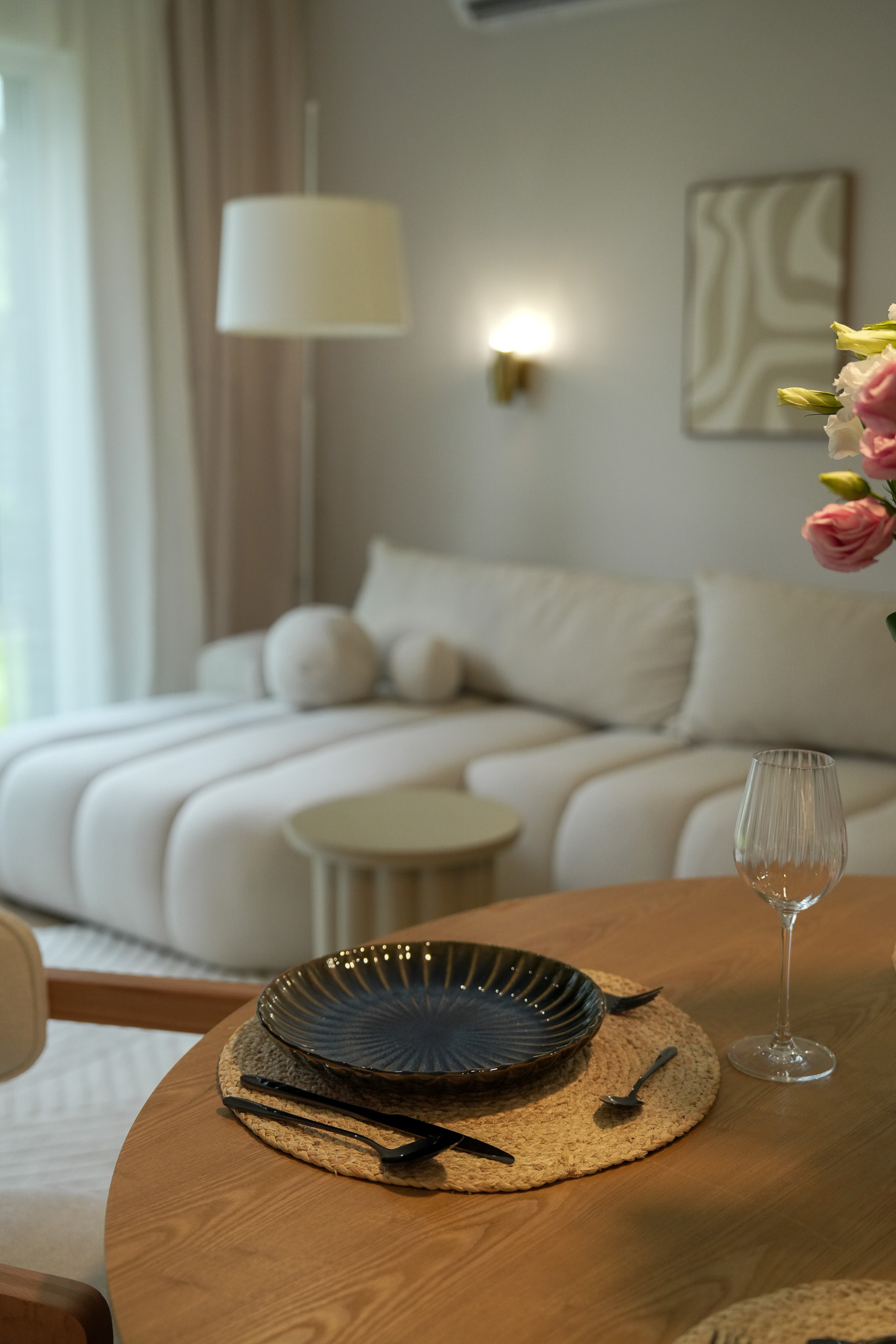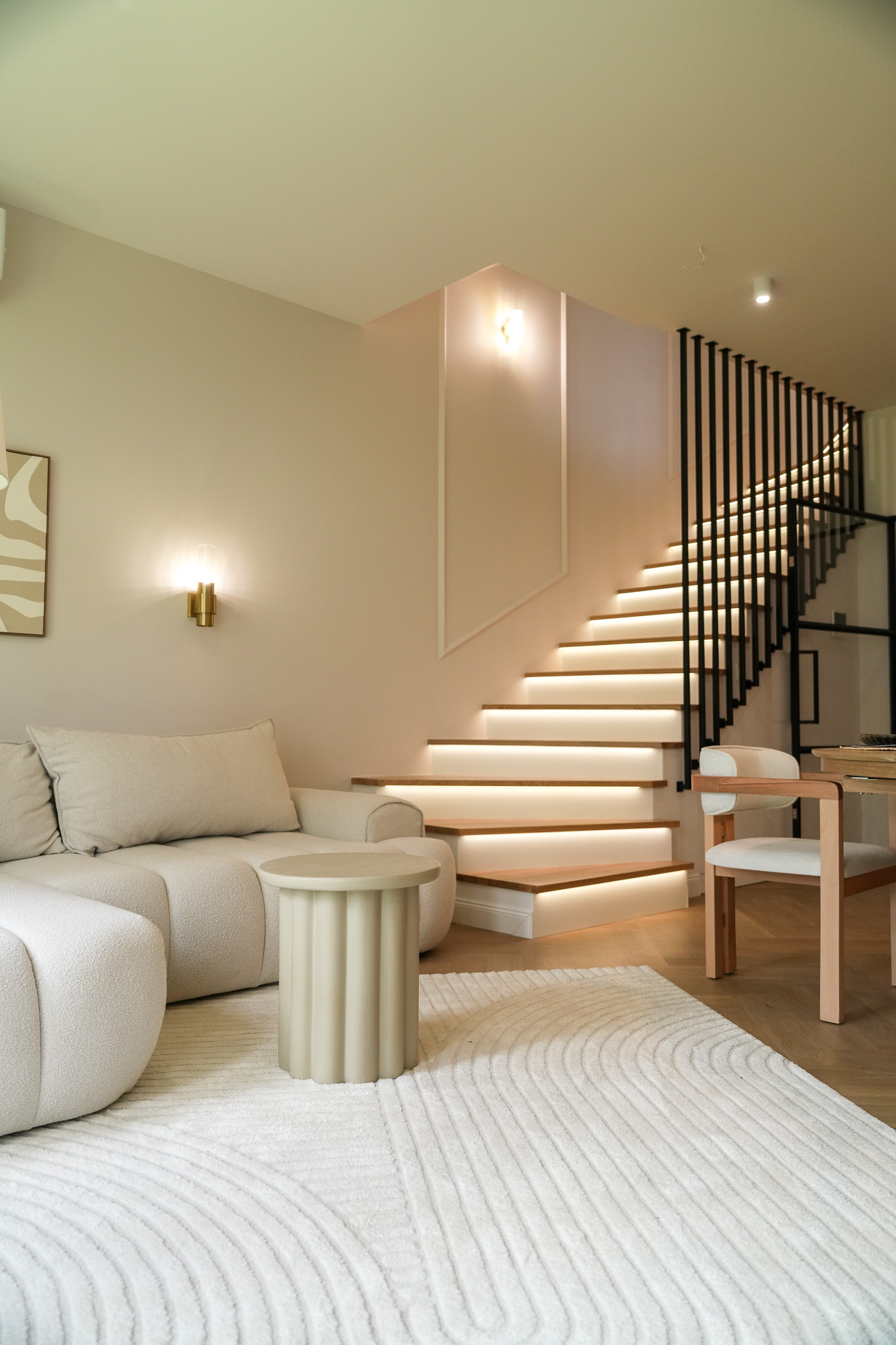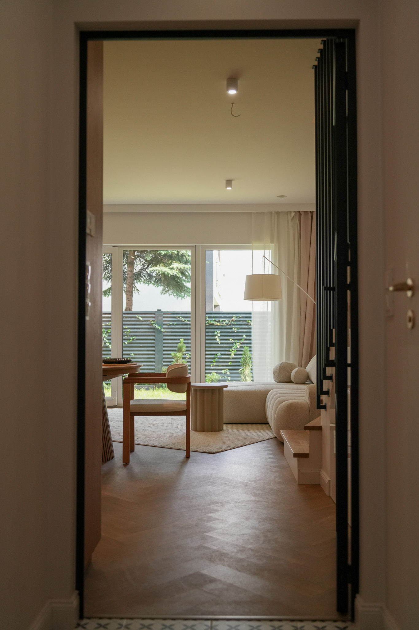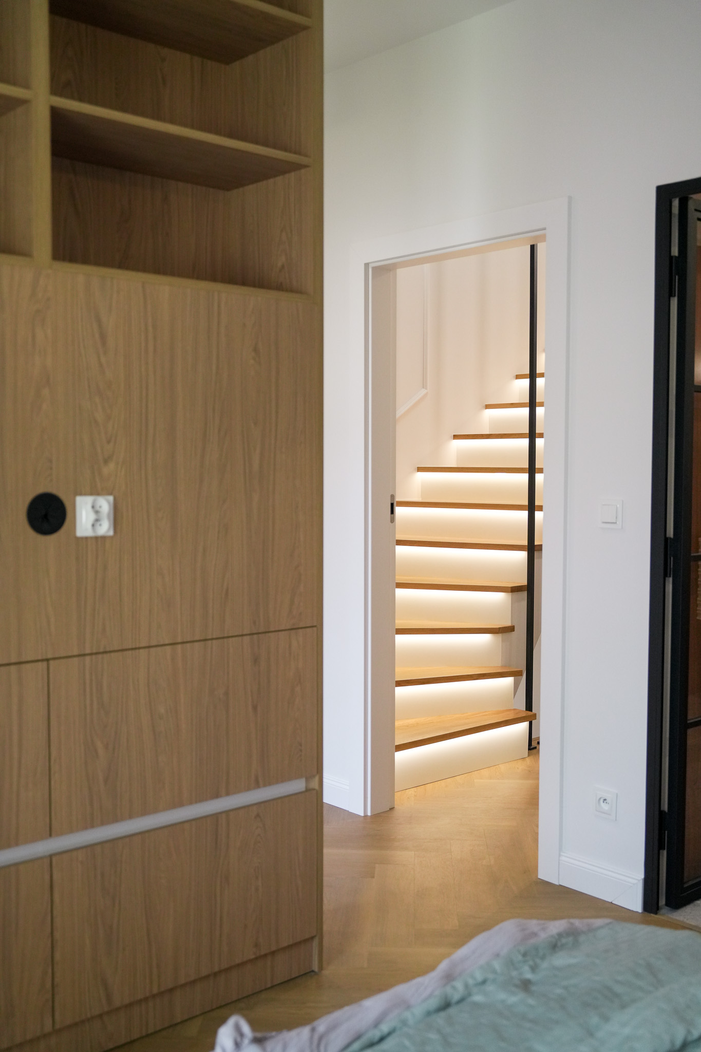 Projekt wnętrza został opracowany indywidualnie, z naciskiem na ergonomię, spójność stylistyczną oraz komfort codziennego użytkowania. Dominują tu jasne beże, subtelne szarości i naturalne drewno, uzupełnione detalami w kolorze szczotkowanego złota oraz czerni. Całość tworzy elegancką, ale ciepłą i przyjazną przestrzeń.