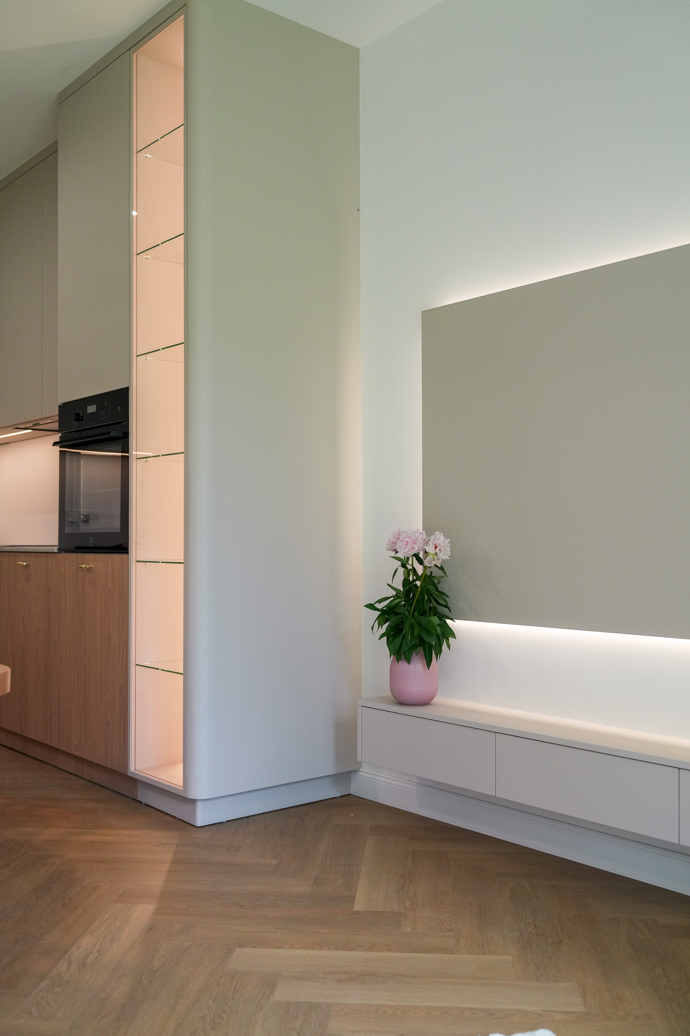 W ramach realizacji wykonaliśmy meble na wymiar, zaprojektowane specjalnie do tego wnętrza. Zastosowaliśmy tutaj: elementy gięte, forniry, fronty są zarówno z akrylu jak i są lakierowane. Zabudowy zostały dopasowane do architektury budynku i maksymalnie wykorzystują dostępną przestrzeń, łącząc estetykę z funkcjonalnością.