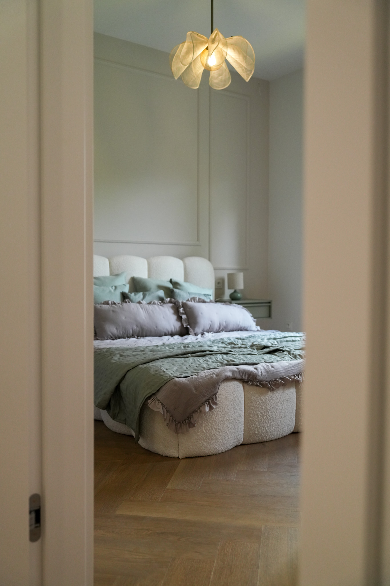 Zastosowaliśmy elementy sztukaterii, frezowane fronty meblowe oraz miękkie formy mebli, co pozwoliło nam połączyć nowoczesny charakter wnętrza z delikatnymi akcentami klasycznymi.